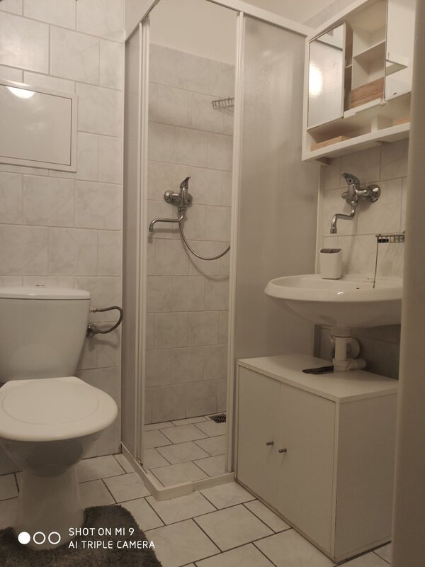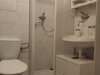 věšákem,koupelnou se sprchovým koutem,umyvadlo se skřínkou a WC,dále