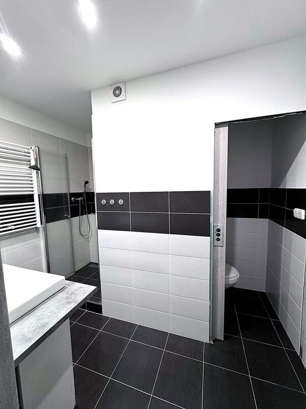 Dispozice nabízí prostornou vstupní chodbu, šatnu, koupelnu a samostatné